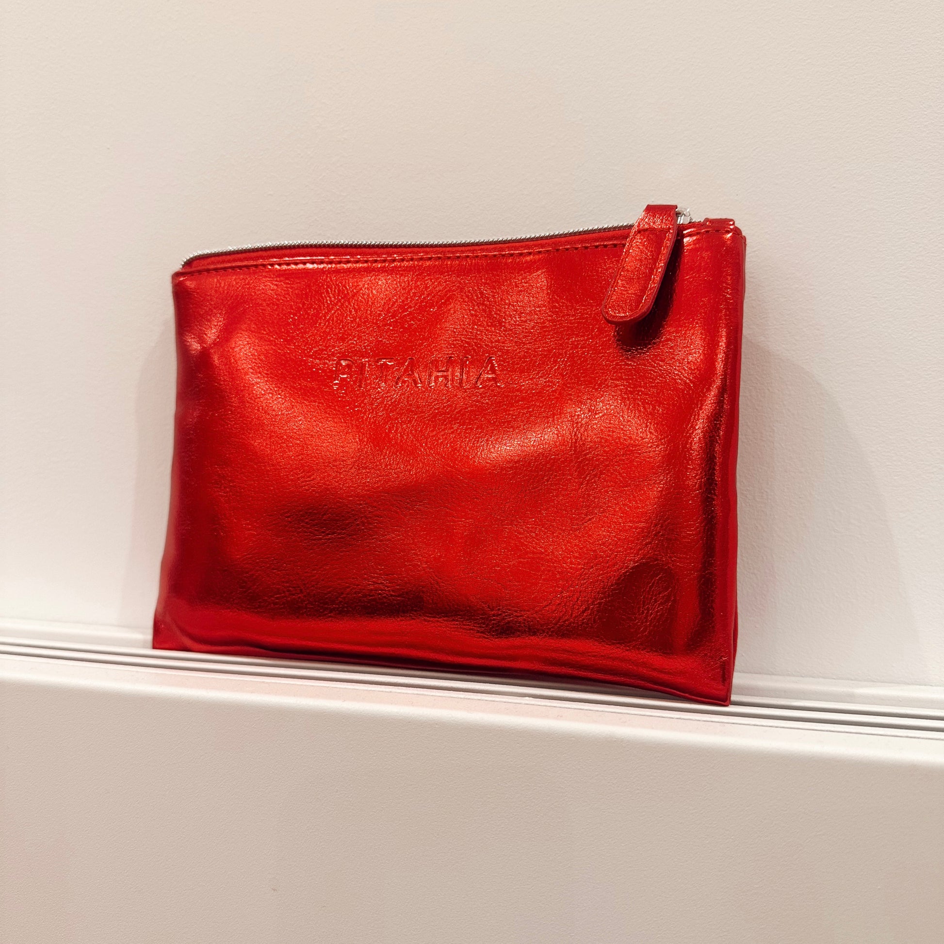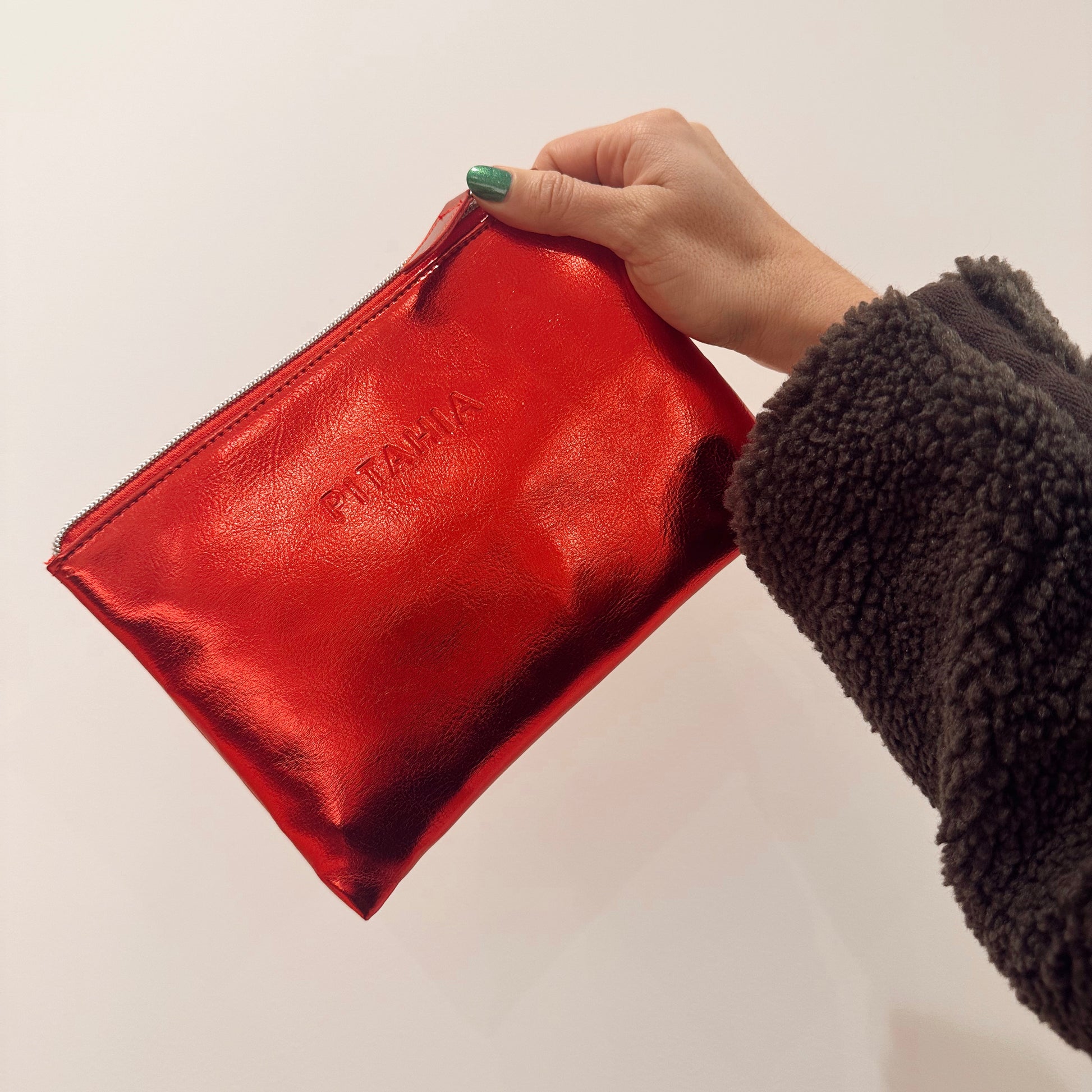 Cosmetiquera flat elaborada en PVC con acabado metálico, forro interior de poliéster y nylon, y cierre con zipper.